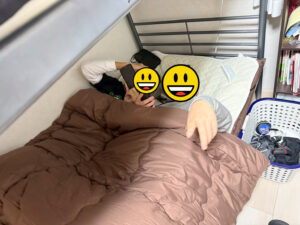 1つのベッドの上で、2人一緒にゲームをしていました😊